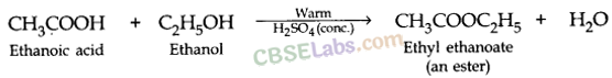 - शंकु की उपस्थिति में एथेनोइक एसिड अल्कोहल के साथ प्रतिक्रिया करता है। H2SO4 अम्ल एस्टर नामक मीठी महक वाले यौगिक बनाने के लिए ।